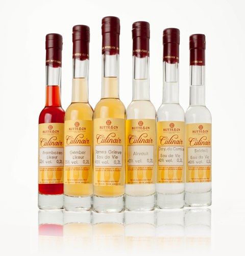 In deze serie verschenen zes 0,2l flesjes om mee te koken. Frambozen likeur, gember likeur, James Grieve eau de vie, akvavit, Doyenne du Comice eau de vie en Selderij.