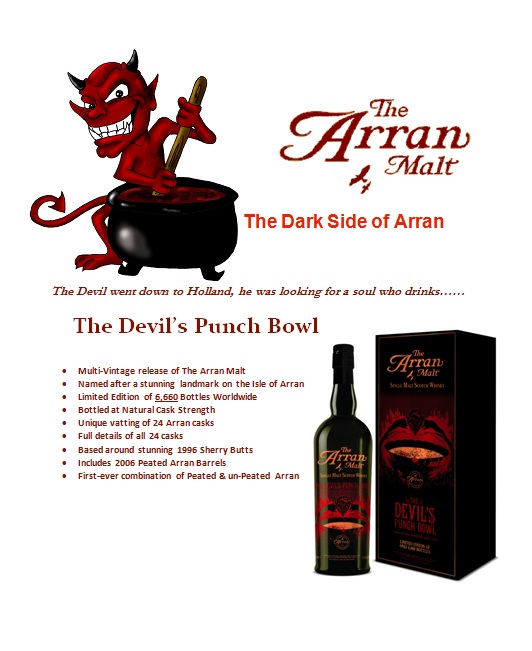Binnenkort verwacht, The Arran Devil’s Punch Bowl. Een nieuwe limited edition (6660 flessen wereldwijd) van The Arran die grotendeels bestaat uit de oudste bottelingen en zal worden gebotteld op Cask Strength van 57,3%. De verwachting is dat de Devil’s Punch Bowl de eerste release in een nieuwe The Arran serie zal zijn. Hieronder de aankondigingsposter van importeur Van Wees Holland.