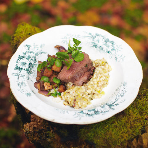 Rol dan elke lende door de verse kruiden en versgemalen peper. Serveer dit gerecht in een groot pastabord. Maak met behulp van een kookring een mooi rondje van de risotto, snijd de hertenlende in tranches en leg deze daar bovenop en besprenkel lichtjes met de truffelolie. Schep de Black Grouse jus om het geheel heen.