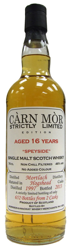 Een 16 jaar oude Mortlach botteling uit de Carn Mor Strictly Limited serie. Gedistilleerd in 1997 en gebotteld in 2013. Een single malt met een rijping op ex bourbon Hogshead vaten. Er zijn slechts twee vaten afgevuld en dus is de Mortlach verkrijgbaar in een beperkte oplage van 652 flessen. Uiteraard niet koud gefilterd (non chill filtered) en zonder toevoeging van kleurstoffen.