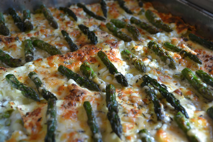 Bedek de bodem van een braadslee of ovenschaal met een kwart van het groentemengsel, dek af met lasagnevellen en rasp er een flinke laag Parmezaanse kaas over. Herhaal dit totdat het mengsel op is en sluit af met lasagne bladen. Roer een scheut water door de rest van de hüttenkäse en smeer dit erop. Bak ondertussen de aspergetopjes met een klein beetje olijfolie kort aan in een koekenpan en verdeel deze over lasagne. Bestrooi daarna met tijmblaadjes, een scheutje olijfolie en een flinke laag Parmezaanse kaas. Zet vervolgens circa 15 minuten in de oven tot de korst goudbruin is.