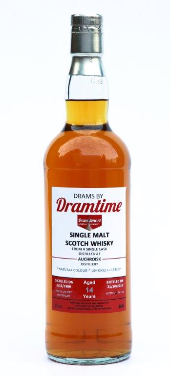 Lang hebben we er op moeten wachten maar hij is er eindelijk, de eerste botteling onder ons eigen Drams By Dramtime label. Deze Drams By Dramtime Auchroisk 14 years old uit 1999 is de eerste botteling onder het eigen en onafhankelijke label van Dramtime.nl en Slijterij Frans Muthert. Een 14 jaar oude Speyside single malt van de Auchroisk distilleerderij. Een relatief jonge distilleerderij, 1974, die in handen is van drankengigant Diageo. Met uitzondering van enkele special releases zijn er geen officiële single malt bottelingen van deze distilleerderij. In de vorige eeuw toen Auchroisk nog door het leven ging als Singleton of Auchroisk waren de releases ook zeer beperkt. Slechts een kleine 20 single malt releases kwamen er op de markt. Verreweg het meeste van de gedistilleerde spirit werd en wordt gebruikt voor de blends van Diageo en dan voornamelijk die van J&B (Justerini & Brooks). Van het kleine gedeelte vaten dat overblijft komen de onafhankelijke bottelingen, maar ook deze zijn schaars.