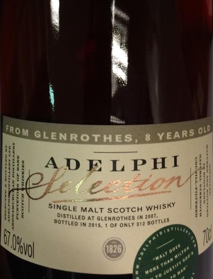 Twee en heel goed. Jonge Glenrothes, zwaar gesherried en gebotteld door Adelphi. Het is een succesvolle formule. Inmiddels hebben we er een paar geproefd waaronder een 6 jaar oude uit 2007 ter viering van het 10 jarige jubileum van Whisky Import Nederland en een 7 jaar oude uit 2007 exclusief voor NL. Nou hadden we het geluk dat we van die beide en hoop flessen konden kopen omdat ze exclusief voor NL waren. Bij de nieuwste release is dit helaas niet het geval….. Desalniettemin hebben we van de Glenrothes 8yo 2007 Adelphi Selection een paar flessen kunnen krijgen. Ware het niet dat ze binnen 3 uur ook weer weg waren. Gelukkig hebben we dit keer wel zelf eentje bewaard en open getrokken, dus nu maar eens een review.