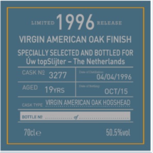 Vorig jaar hadden we als topSlijter organisatie een mooie single cask botteling van GlenDronach, uit een virgin oak hogshead en 11 jaar oud. Dit jaar is er een nieuwe release maar dan iets ouder en van Benriach, de Benriach 19 years old 1996 Single Cask 3277 Virgin American Oak Finish Specially Selected and Bottled for Uw topSlijter. Een 19 jaar oude Speyside single malt van Benriach gefinished in virgin American oak hogshead 3277. Een single cask release speciaal voor de Nederlandse slijtersorganisatie Uw topSlijter waartoe wij ook behoren. Gedistilleerd op 4 april 1996 en gebotteld in oktober 2015 op vatsterkte (cask strength) van 50,5%, non chill filtered en zonder toevoeging van kleurstoffen. Een gelimiteerde single cask relase van circa 340 flessen.