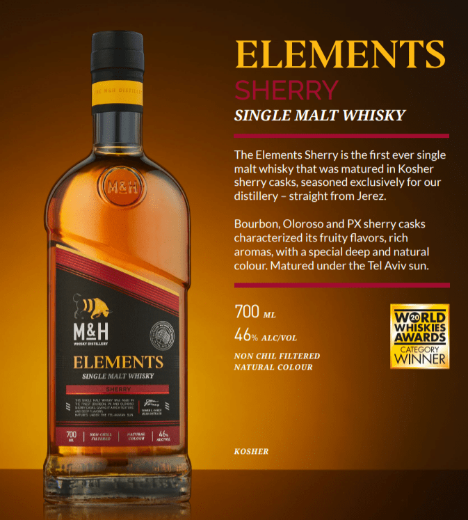 De Elements Sherry Cask heeft gerijpt in koshere Oloroso en PX Sherry butts. Na een rijping in bourbon vaten rijpt deze Milk & Honey verder in deze sherry vaten. De Elements sherry wordt dan gebotteld op 46% en heeft veel tonen van rood fruit, vanille en chocolade