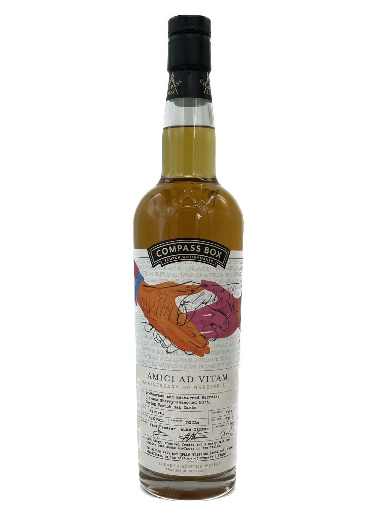 De Compass Box Amici Ad Vitam is een speciale release van Compass Box speciaal voor het 30 jarig jubileum van de Nederlandse importeur Bresser & Timmer. Op dertig jaar van vriendschap en zakelijke contact, zoals ze het zelf zo mooi zeggen! “Wat we hier samen kunnen vieren is een uitzonderlijke prestatie. En een reis vol voldoening, zoals een vriendschap hoort te zijn.
