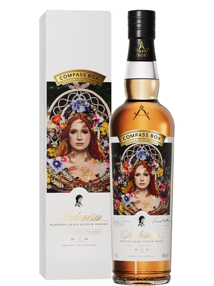 Voor de 2026 editie is Compass Box de samenwerking aangegaan met kunstenares Emma Hack. Op basis van foto’s van actrice Karen Gillan heeft zij het label van de Hedonism 2026 gemaakt. Een nieuwe frisse interpretatie gemaakt van de ‘Hedonism vrouw’ die al sinds jaar en dag op het Hedonism label staat.