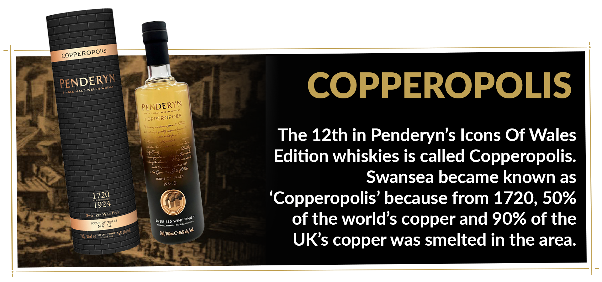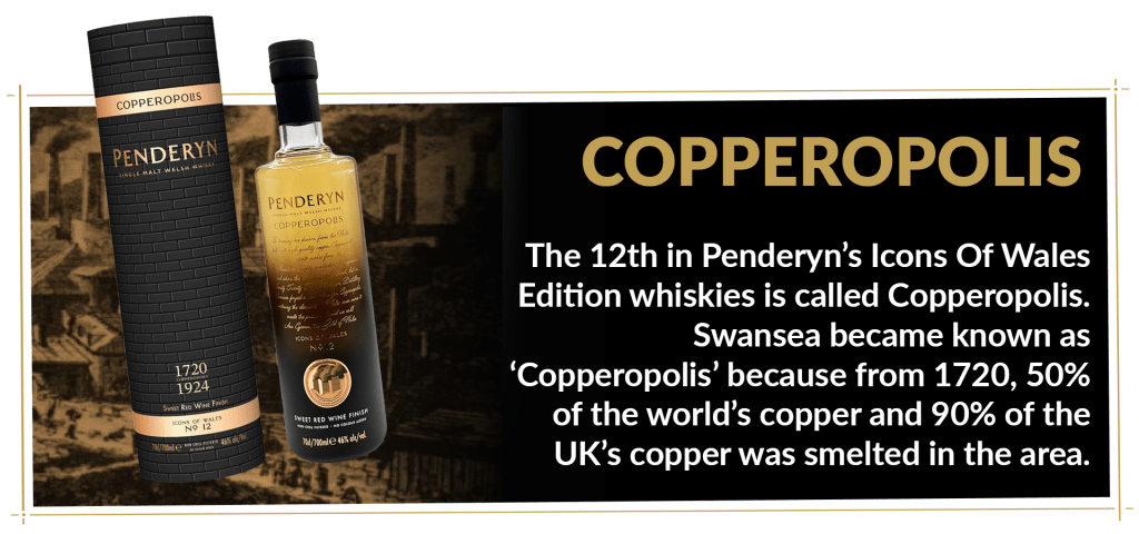 De twaalfde Icons of Wales botteling van Penderyn, de Copperopolis, is in aantocht! De Copperopolis viert de hoogtijdagen van de koperindustrie in de 19e eeuw en de belangrijke positie van Wales, en in het bijzonder Swansea, daarin. 50% van het koper wereldwijd en 90% van het koper in het Verenigd Koninkrijk werd in die tijd in deze regio gesmolten. Tegenwoordig bevindt zich de nieuwste distilleerderij van Penderyn zich in het Powerhouse, de oude koperfabriek van Swansea.